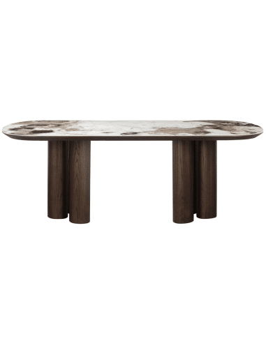 LANGFORD Ovalt spisebord fra hollandske Richmond Interiors, udført i et design af brunlakeret egetræsfinér og MDf med bordplade i brun marmoriseret keramik. Spisebordet måler 75 cm i højden og 230 x 110 cm i bredde og dybde.